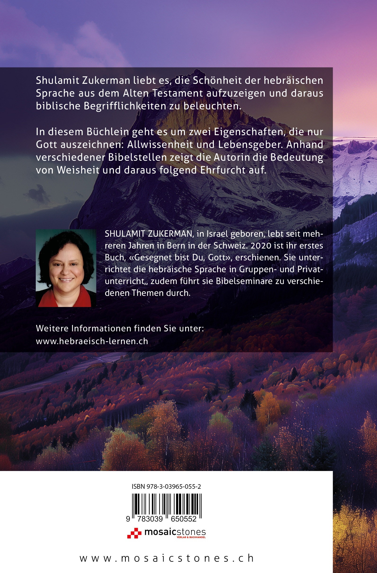 In diesem Büchlein geht es um zwei Eigenschaften, die nur Gott auszeichnen: Allwissenheit und Lebensgeber. Anhand verschiedener Bibelstellen zeigt sie die Bedeutung von Weisheit und daraus folgend Ehrfurcht auf.
